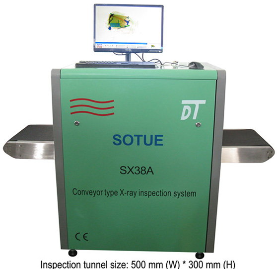 SOTUE SX38A tunnel conveyor type x-ray inspection baggage & parcel system is used for explosives and suspicious dangerous goods inspection, it can be installed in banks, stadiums, casinos, courts, prisons, embassies, police cars, mosques, churches, checkpoints and so on for security inspection, widely used in stations, banks, stadiums, courts, prisons, mosques, labor camps, detention centers, schools, big speech places, churches, embassies, exhibition, troops, postal parcel inspection & other security departments for security checks and so on.