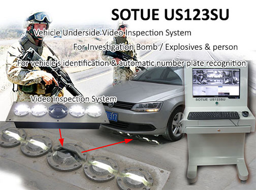 SOTUE US123SU system product is a kind of security inspection vehicle underside system, inspect if there is illegal changing underbody, hiding drugs & bombs, other prohibited items or any person in the vehicle's underbody, the product has a high level design of security protection, can work under any harsh environment.