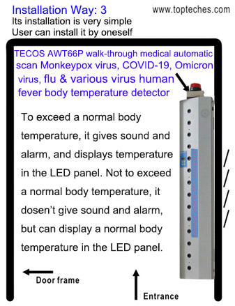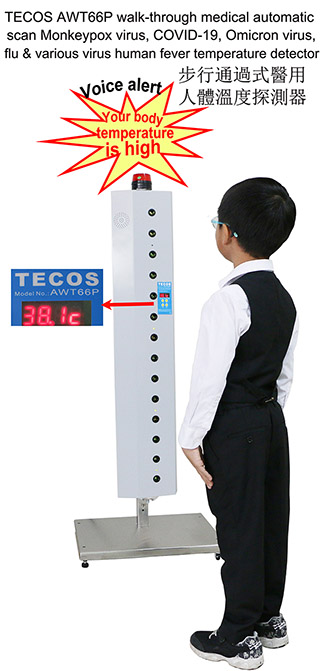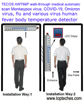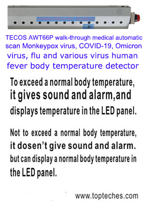 AWT66P步行通過醫用掛式自動掃描人體溫度探測器探測Omicron奥密克戎病毒及JN.1病毒和COVID-19新冠病毒及登革熱病埃博拉病和其他流感與病毒人發燒溫度,遇發燒病人,儀器即提示, 詳情目錄,請訪問: www.topteches.com