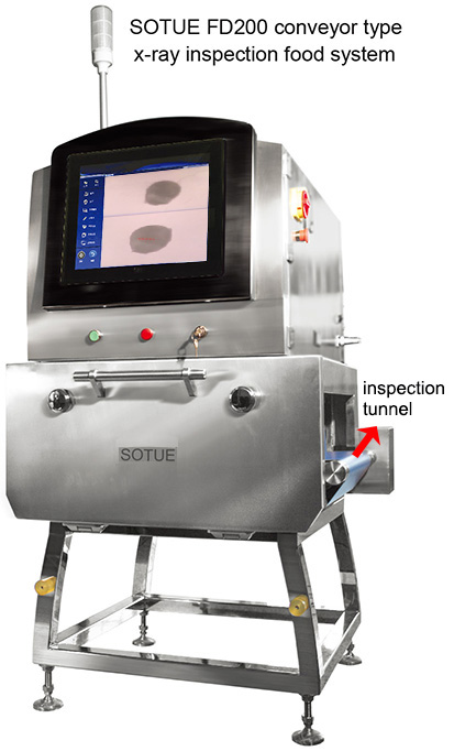 FD200 conveyor type x-ray inspection food and medicine system can detect all kinds of packed and no packed products, such as food (for example: bread, fast food, dim sum / snack, beef, chicken, mutton, fish, pork, etc.), medicine, chemical products, etc., can find metal, glass, ceramic, stone, bone, hard rubber, hard plastic in food, medicine and chemical products etc., and can provide excellent product integrity detection and identify product defects and so on.
